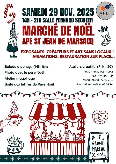L’APE de l’Ă©cole de St Jean de Marsacq organise son marchĂ© de NoĂ«l annuel, avec de nombreux exposants et artisans locaux et des animations pour les enfants.